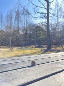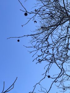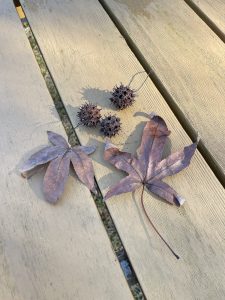 アメリカフウの実はトゲトゲシした丸い形が特徴的で、軍手でつかむとくっついてなかなか離れてくれません。