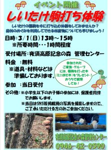 イベント開催のお知らせ【しいたけ駒打ち体験】3/1(日)13時~15時