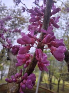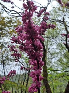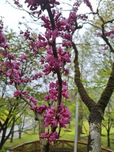 ⑨園内に咲いているハナズオウの花です。今回植林したハナズオウも、花を咲かせて渓流園を華やかに彩ってくれることでしょう☺️